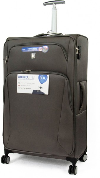 Велика валіза з гарною місткістю, оптимальний вибір для сімейної подорожі. Елегантний дизайн, практичний темно-сірий колір, лаконічні форми. Легкий та міцний матеріал – поліестер, з двоколірним ефектом. На лицьовій частині розташовані дві автономні кишені. В наявності висувна моноручка, і дві для перенесення - зверху і на боці. Чотири подвоєні пластикові колеса забезпечують плавний хід і відмінну поворотливість у різних умовах. TSA замок, що забезпечує безпеку та надійна блискавка. Розміри 48,5 x80, 5x29 см, вага 3,3 кг, об'єм - 98 л