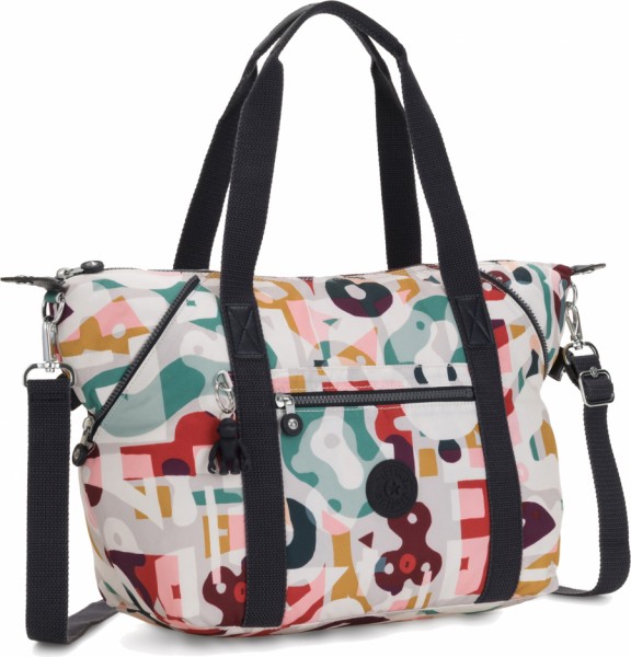 Містка сумка середнього розміру, гарний варіант у дорогу. Унікальний сучасний дизайн з емблемою бренду у вигляді нашивки, мінлива форма та різнокольоровий малюнок на білому тлі. Може набувати прямокутної форми завдяки куточкам на блискавці. Матеріал-поліамід, міцний, зносостійкий та довговічний, не згинається і не помається. На лицьовій частині розміщена кишеня для різної дрібниці. Усередині розташоване велике об'ємне відділення, і маленька автономна кишеня для смартфона або ключів. Для перенесення створені дві довгі ручки та наплічний ремінь. Розміри-44 * 27 * 20, об'єм - 21 л, вага - 0,55 кг.