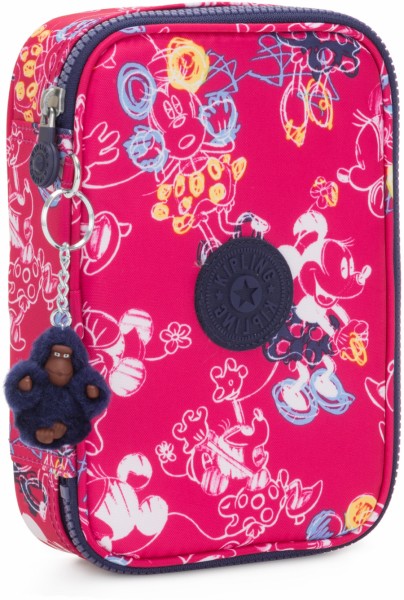 Пенал для ручок Kipling 100 Pens KI0347_6DM рожевий. Серія – Mickey. Форма – вертикальна. Вага – 0,3 кг. Параметри – 21x15x5см. Об'єм – 1,5 л. Пенал виготовлений із щільного поліестеру із зображенням Міккі Мауса та прикрашений логотипом бренду спереду. Складається з одного основного відділення, яке поділено на дві частини. Закривається на блискавку. Футляр має 26 відсіків для ручок. Фірмовий брелок з мавпочкою йде в комплекті. Виробництво – Бельгія. Гарантія 2 роки.