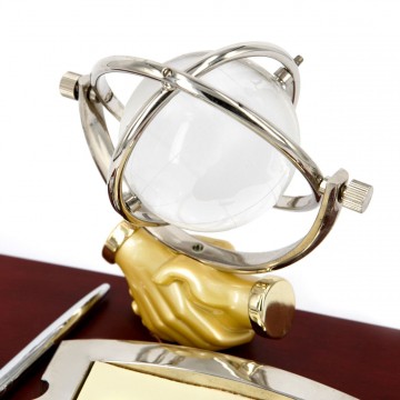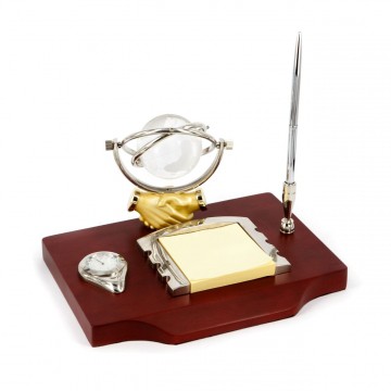 Настільна підставка з металу та дерева оригінальний подарунок для керівника, колеги або ділового партнера, основна функція настільних підставок-естетична і завдяки годинникам цілком практична. Настільна підставка складається з глобус-рукостискання, годинник, ручка, підставка під папір. Розмір: 27х21х16 см.