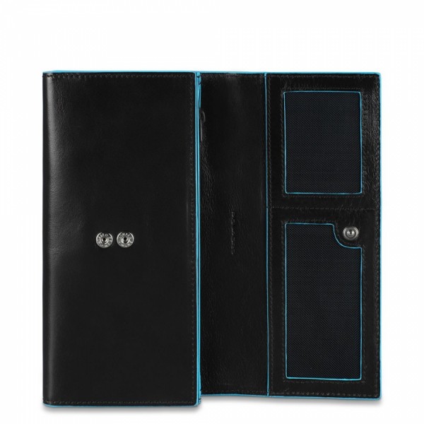 Многофунуциональное женское портмоне.Материал иготовления-телячья кожа гладкого дубления,отполированная до глянца,склонная к механическим повреждениям.Все наружные швы изделия запаяны вручную жидким каучуком насыщенного голубого цвета по уникальной запатентованной технологии компани Piquadro.Закрывается клапаном на двойную кнопку,обьем содержимого регулируется.Раскрывается за принципом розкладачки, складається з трьох частин.. При розкритті-перша частина має дві кишеньки під сіткою різного розміру для документів. завантажуються без згину) і монетниця на блискавці. Далі-два ряди горизонтальних осередків для кредиток по 2 шт. Третя частина має дві горизонтальні кишені різного розміру для документів і 7 вертикальних осередків для карт. Третя частина пристібається до другої кнопки, перша частина закриває їх обидві клапаном на кнопці.