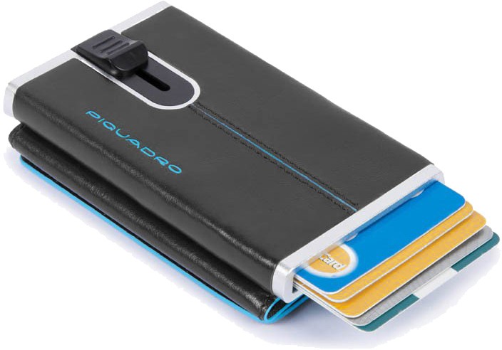 Портмоне PIQUADRO чорний BL SQUARE PP4891B2R_N - кредитниця портмоне з інноваційним висувним механізмом та захистом RFID від зчитування інфо з картки. Універсальний чорний колір із блакитним кантом, полірована блискуча поверхня та лаконічний дизайн. Матеріал-міцний метал та теляча шкіра, стійка до зносу. Усередині знаходиться одне відділення із секціями для кредитних карток. Розміри-6,2x10,5x2 см.