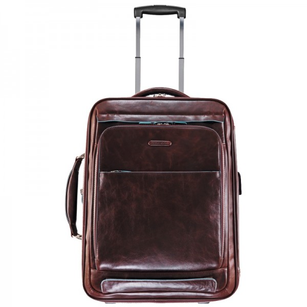 Габаритна валіза представницького класу. Матеріал виготовлення-теляча шкіра гладкого дублення, відполірована до глянцю, схильна до механічних пошкоджень. Всі зовнішні шви виробу запаяні вручну рідким каучуком насиченого блакитного кольору за унікальною запатентованою технологією компанії Piquadro. жорсткий каркас. Відділень-одне, розкривається на дві половини, завантаження горизонтальна. до внутрішніх механізмів телескопічної ручки і коліс. З протилежного боку відділення-знімний текстильний портплед для сорочок і дрібних предметів одягу, кріпиться до стінки відділення на липучку. Відділення має текстильне розширення на 6см. кишеню н