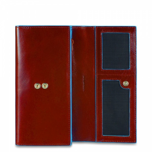 Многофунуциональное женское портмоне.Материал иготовления-телячья кожа гладкого дубления,отполированная до глянца,склонная к механическим повреждениям.Все наружные швы изделия запаяны вручную жидким каучуком насыщенного голубого цвета по уникальной запатентованной технологии компани Piquadro.Закрывается клапаном на двойную кнопку,обьем содержимого регулируется.Раскрывается за принципом розкладачки, складається з трьох частин.. При розкритті-перша частина має дві кишеньки під сіткою різного розміру для документів. завантажуються без згину) і монетниця на блискавці. Далі-два ряди горизонтальних осередків для кредиток по 2 шт. Третя частина має дві горизонтальні кишені різного розміру для документів і 7 вертикальних осередків для карт. Третя частина пристібається до другої кнопки, перша частина закриває їх обидві клапаном на кнопці.