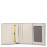 Маленький вертикальний портмоне кишенькового формату для купюр дрібного номіналу. Матеріал виготовлення-теляча шкіра гладкого дублення, відполірована до глянцю, схильна до механічних пошкоджень. Всі зовнішні шви виробу запаяні вручну рідким каучуком насиченого блакитного кольору за унікальною запатентованою технологією компанії Piquadro. 2 горизонтальні осередки для карт, під ними - по дрібній кишеньці для документів. -пластиковий знімний картхолдер зі шкіряною основою, вставляється в будь-яку з осередків. вилучення. Розмір-7 * 9,3 * 1,5.