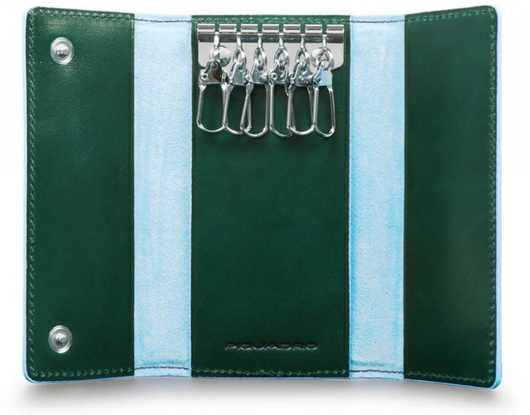 Ключница кожаная Piquadro BL SQUARE PC4521B2_VE6. Стильная ключница зеленого цвета. Удобная модель, станет настоящим подарком для поклонников эргономичных и компактных аксессуаров. Изготовлен из гладкой телячьей кожи с восковой пропиткой, защищающей от влаги и загрязнений. Голубой кант придает портмоне стильный вид и делает его узнаваемым. Ключница закрывается на две кнопки. Внутри 6 карабинов для ключей. С этим аксессуаром Ваши ключи всегда будут под рукой. Компактная и стильная модель подойдет тем, кто ценит практичные и качественные вещи Материал: Высококачественная кожа. Цвет: Зеленый. Размеры: 6,5x12x1,5 см. Вес: 0.056 Производитель: Италия Гарантия: 1 года