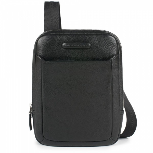 Вертикальна сумочка із закругленими краями на плечовому ремені середньої ширини (3см.). Матеріал виготовлення - теляча шкіра фактурного дублення, стійка до механічних пошкоджень. Підкладка - водостійкий текстиль. ),пенал для двох ручок,кишеня для телефону(виконані з тканини-гумки)і неопреновий відсік для міні-планшета(7").Із зовнішнього боку-невелика кишеня на блискавці.Плечовий ремінь-міцний тестиль,довжина регулюється за допомогою сталевого фіксатора ,Максимальна довжина-140см.Має глибоке розкриття для комфортного доступу.Розміри-16*22*4,5.Колір-чорний.