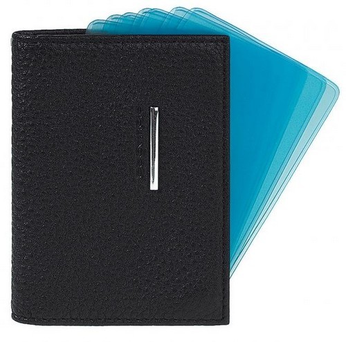 Стильний вишуканий аксесуар. Матеріал виготовлення-теляча шкіра фактурного дублення, стійка до механічних пошкоджень. Виготовлений за принципом книжки, яка має в правому нижньому куті кріплення у вигляді кнопки, що не розстібається. віяла, щоб дістати потрібну карту, не потрібно нічого відкривати, достатньо розгорнути віяло. 10*1.2.Колір-чорний.
