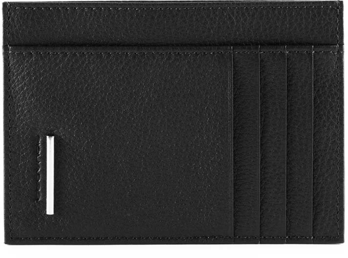 Максимально тонка вертикальна кредитниця відкритого типу. Зовнішній матеріал виготовлення - теляча шкіра фактурного дублення, стійка до механічних пошкоджень. Виконана у відкритого конверта без клапана. з виступом, у кожний з яких можна помістити по кілька карт. Усередині конверта-кишеня на весь розмір кредитниці, може бути використаний для документів, або для купюр у складеному навпіл вигляді. карт та документів.Розмір-9.5*12,5*0.2.Колір-чорний.