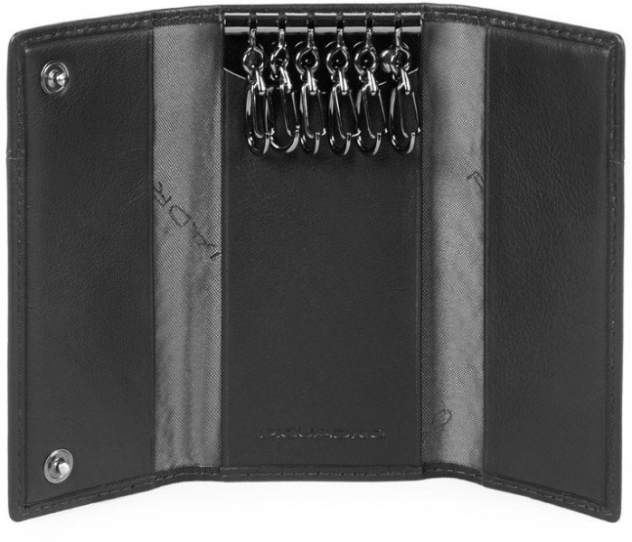 PC4521UB00_N.Компактная вертикальная ключница из коллекции URBAN.Материал изготовления-гладкая телячья кожа.Подкладка-скользящая ткань с принтом лого компании,материал-полиэстер.Форму сохраняет за счет уплотнителя.Застегивается "на запах" на две тугие кнопки.Внутри-пластина из сверхпрочной стали,на которую крепятся 6 карабинов для 6 ключей среднего размера.При раскрытии на всех трех планках имеются по небольшому кармашку для карт,документов.Размер-6*12*1,5.Цвет верха-черный,подкладки-серый