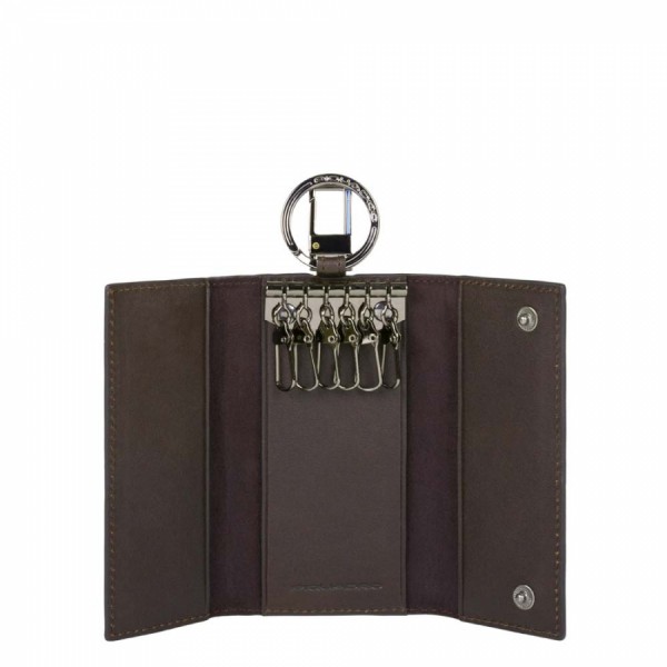 PC1397B3_TM.Компактная вертикальная ключница из коллекции BK SQUARE. Материал изготовления-телячья кожа с нaтуральным рисунком,устойчивая к механическим повреждениям.Все наружные швы изделия запаяны вручную жидким каучуком черного цвета по уникальной запатентованной технологии компани Piquadro.Форму сохраняет за счет уплотнителя.Застегивается "на запах" на две тугие кнопки.Внутри-планка из сверхпрочной стали,на которую крепятся 6 карабинов для 6 ключей небольшого размера.Сверху на кожаной петельке-стальное кольцо с тиснением названия фирмы,на которое можно крепить длинный либо приоритетный ключ.На этой же петле-карабин с логотипом фирмы для крепления связки в ключнице внутри или снаружи сумки.Размер-6*12*2.Цвет-коричневый.