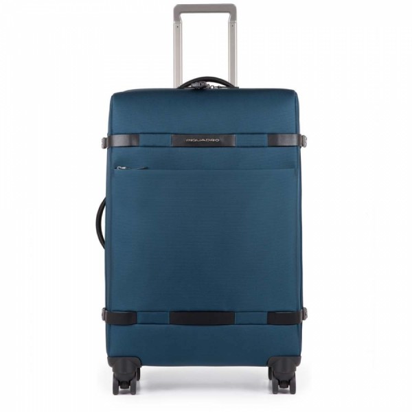 BV3874M2_BLU. Містка валіза правильної прямокутної форми середнього розміру із колекції MOVE2. ялинка", матеріал-поліестер. Відмінною деталлю дизайну колекції є наявність двох поздовжніх ременів з щільної шкіри, вшитих у верхній і нижній частині валізи, які застібаються з боків засувками з пластику і металу і виконують функцію додаткової застібки а також призначені для регулювання об'єму. Відділень-одно. Розкривається пластиковою блискавкою на дві половини. Задня половина має каркас, передня-м'якша. трубчастими ущільнювачами для захисту від складок