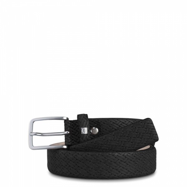 CU3417C45_N.Тонкий чоловічий ремінь для штанів з колекції ременів Piquadro.Матеріал виготовлення верха-теляча шкіра з імітацією "плетінки", внутрішня частина-теляча шкіра гладкого дублення. виготовлена з високоякісної сталі, колір-матове срібло. Форма пряжки-прямокутна з закругленими кутами. На ремені є шкіряне кільце для фіксації вільного краю. Ремінь має довжину 125см.і розрахований для штанів до 56 розміру.Ширіна-3см.Колір верха-чорний, зсередини-бежевий.