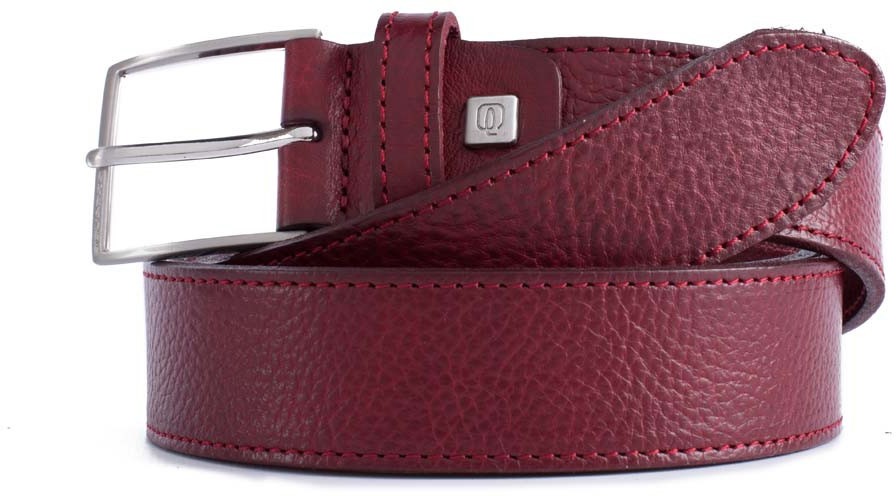CU4557C61_BO.Неширокий чоловічий брючний ремінь стриманого дизайну з колекції ременів Piquadro.Матеріал виготовлення-теляча шкіра фактурного дублення,стійка до механічних пошкоджень.Виготовлений з двох шарів шкіри,краю запаяні і прошиті. темного срібла з матовим блиском. Рамка пряжки має форму тонкого обідка. Форма пряжки-прямокутна, з закругленими кутами. Ремінь має довжину 125см.і розрахований для штанів до 56 розміру.Ширіна-3,5см.Колір-бордо.