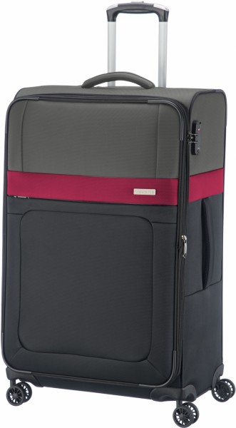 Велика, містка сімейна валіза. Стильний дизайн і візуально цікавий зовнішній вигляд у двох кольорах-чорний з вишневим та сірим. Усередині розміщена одна велика речова камера з фіксуючими ременями з обох боків, а на лицьовій панелі – кишеня на блискавці зі швидким доступом. Завдяки чотирьом подвоєним колесам та телескопічній висувній ручці пересування буде легким, безшумним та комфортним. Для перенесення також є малі широкі ручки. За безпеку багажу відповідає вбудований цей замок з кодовим блокуванням. Матеріал - міцний та довговічний поліестер, стійкий до розривів та вологості. Розміри-47*76*31/35, вага-3,6 кг, об'єм-103/117 л.