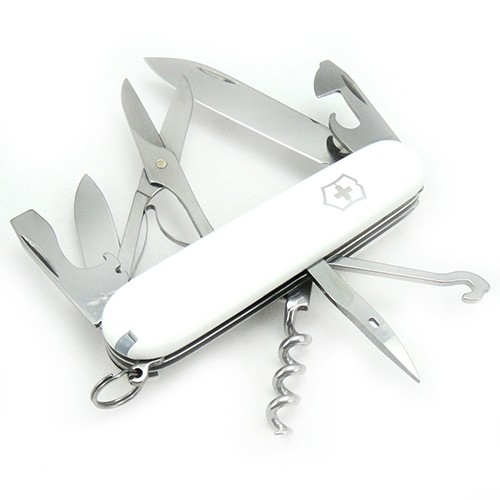 Ніж Victorinox CLIMBER Vx13703.7 - складаний швейцарський ніж. Зручний та практичний. Матеріал лез-нержавіюча сталь. Рукоятка покрита спеціальним пластиком, колір-білий. Ніж оснащений 11 предметами, що виконують 14 функцій. Серед них – два ножі, дві відкривалки (для пляшок та консерви), штопор, шило та гачок, ножиці, зубочистка та пінцет, кільце для ключів. Розміри-91мм