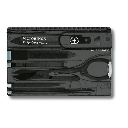 Ніж Victorinox SWISSCARD Vx07133.T3 - швейцарська карта складана. Колір темний, напівпрозорий. Виконано із пластику. Матеріал інструментів - нержавіюча сталь. Карта містить 8 елементів, які виконують 10 функцій. Вона має такі предмети - ножиці, пилка для нігтів, пінцет, ніж для листів, кулькова ручка, зубочистка, велике лезо, шпильку. Розміри-82 * 54,5 * 4,5