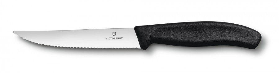 Кухонный нож Victorinox SwissClassic Steak&Pizza Vx67933.12- классический кухонный нож с волнистым лезвием и заостренным носом. Универсальный помощник на вашей кухне. Идеально подходит для нарезки пиццы или стейка. Рукоять изготовлена из полипропилена, цвет- черный. Материал лезвия- нержавеющая сталь, длина- 12 см.