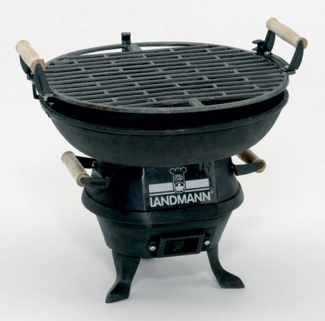 Гриль виготовлений повністю із чавуну. Оснащений регулюванням тяги повітря і вугільними гратами. Гриль має форму барила.