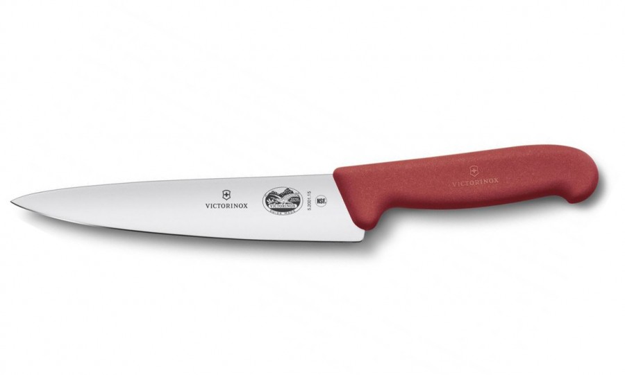 Кухонний ніж Victorinox Fibrox Carving Vx52001.15 - швейцарський кухонний ніж, з короткою піднятою ручкою та широким лезом. Колір рукояті-червоний, матовий, матеріал-термоеластопласт. Лезо виготовлене з нержавіючої сталі, довжина-15 см.