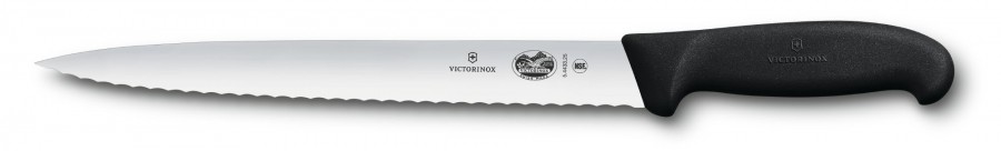 Кухонний ніж Victorinox Fibrox Slicing Vx54433.25 - універсальний кухонний ніж, з ручкою, що зручно лежить, і довгим хвилястим лезом. Колір рукояті-чорний, матовий, матеріал-термоеластопласт. Довжина леза-25 см, виготовлено з нержавіючої сталі.
