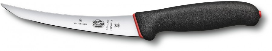 Кухонний ніж Victorinox Fibrox Boning Flex Vx56613.15D - кухонний швейцарський обвалочний ніж. Ширина середня, лезо вузьке та зігнуте до верху, кінець загострений. Довжина леза - 15 см, матеріал - нержавіюча сталь. Рукоятка Dual Grip, колір-чорний, виготовлено з термопластику.