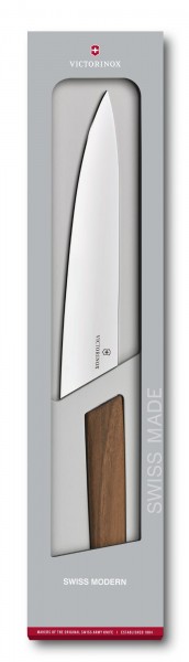 Кухонний ніж Victorinox Swiss Modern Carving Vx69010.22G - швейцарський кухонний ніж з дерев'яною ручкою горіхового кольору і широким лезом. Матеріал леза – нержавіюча сталь, довжина – 22 см. Універсальний повсякденний варіант. Запаковано в сіру коробку.