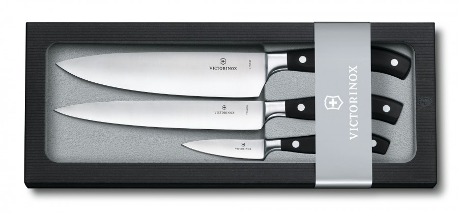 Набір кухонний Victorinox Grand Maitre Сhef's Vx77243.3 - кухонний набір у сірій подарунковій упаковці. Він складається з трьох ножів різної довжини-для шатківниці зелені та нарізки овочів, універсальний і великий, професійний з широким лезом. Рукоятка виконана в чорному кольорі, матеріал-поліоксиметилен.