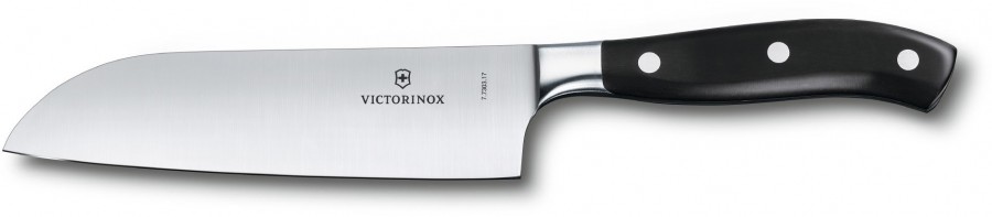 Кухонний ніж Victorinox Grand Maitre Santoku Vx77303.17G- кухонний кований ніж сантоку з широким масивним лезом у подарунковій упаковці. Колір рукояті-чорний, матеріал-поліоксіметилен. Довжина леза-17 см, виготовлено з нержавіючої сталі.