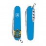 Складаний швейцарський ніж Victorinox CLIMBER UKRAINE Vx13713.7R6.Колір рукояті-блакитний з українською символікою(тризуб).Матеріал інструментів:високоякісна нержавіюча сталь.Матеріал накладок рукояті:поліамід(глянець).Ніж містить набір предметів виконуючих 15 штопор,шило-кернер,зубочистка,пінцет,пила,кільце для ключів,мале леза,відкривання пляшок+6мм викрутка+інструмент зняття ізоляції,консервний ніж+3мм викрутка,ножиці,гачок. Довжина:91мм Країна реєстрації бренду:Швейцарія Країна виробник:Швейцарія Довічна гарантія