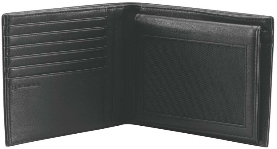 Велике, містке портмоне - вибір максималістів. Натуральна гладка шкіра, класичний дизайн і чорний колір – строго та по діловому. На двосторонньому розвороті розмістилося відділення для дрібниці на кнопці, з прозорим віконцем та 8 секцій під кредитні, дисконтні картки. Також присутні два відділи для купюр-дрібних та великих. Розміри виробу - 13,3 * 1 * 2,5