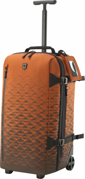 Дорожня сумка на колесах середнього розміру - чудове рішення для подорожі вдвох. Модний, незвичайний оригінальний дизайн та приглушено-жовтогарячий колір з графічним малюнком. Її функціональність вражає одне велике відділення на блискавці зі зручним доступом, кишеню на задній частині для взуття, на передній - вбудований відділ для ноутбука. Має можливість розширення. Для підтримки форми додатково фіксується ременями. Має дві широкі ручки для перенесення, висувної телескопічної, захованої в кишеню. Зручність пересування забезпечують два роликові колеса. Матеріал-поліестер, щільний, зносостійкий, водонепроникний. Розміри-36*65*28/31, вага-2,72 кг, об'єм-55/58 л.