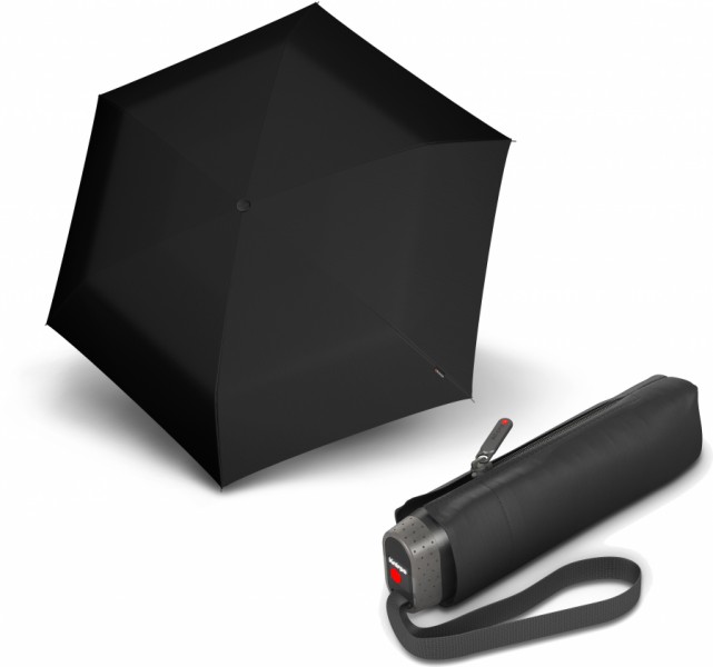 Парасолька Knirps Kn95 4010 1000 чорна. Серія TS.010 Slim Small Manual. Розмір бані - 94 см. Довжина складеної парасольки - 18 см. Вага - 200 гр. Складна парасолька механічна - відкривається і закривається вручну. Матеріал каркасу зі спеціального сплаву алюмінію та скловолокна, що забезпечує міцність конструкції, незважаючи на легку вагу. Матеріал спиць – алюміній. Матеріал наконечників – скловолокно. Містить 8 спиць. Матеріал купола – 100% поліестер. Покриття купола забезпечує водо-і брудовідштовхувальні властивості. Парасолька має м'який чохол, завдяки якому його можна покласти в нього навіть у вологому стані. Забезпечений системою "антивітер". За рахунок якої спиці парасольки не ламаються навіть під дією сильного вітру. Ручка в чорно - сірому кольорі з символом компанії Knirps - червона точка. Для зручності використання ручка оснащена петлею, за рахунок якої можна носити парасольку в руці, зап'ястя або вішати на гачок. Матеріал ручки: пластик. Гарантія – 2 роки. Виробництво – Німеччина.