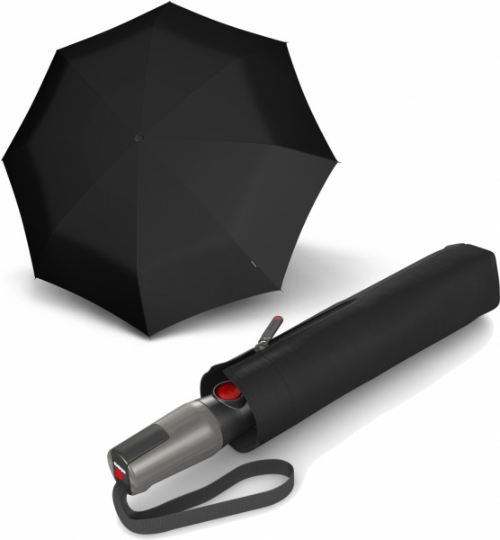 Парасоля Knirps Kn95 3400 1000 чорний. Серія T.400 Extra Large Duomatic. Розмір бані - 115 см. Довжина складеної парасольки - 36 см. Вага - 580 гр. Повний автомат – процес відкривання та закривання виконується за допомогою однієї кнопки. Матеріал каркасу зі спеціального сплаву алюмінію та скловолокна, що забезпечує міцність конструкції, незважаючи на легку вагу. Матеріал спиць – поліамід. Матеріал наконечників - фіберглас. Містить 8 спиць. Матеріал купола – 100% поліестер. Покриття купола забезпечує водо- і брудовідштовхувальні властивості. Парасолька має м'який чохол, завдяки якому його можна покласти в нього навіть у вологому стані. Забезпечений системою "антивітер". За рахунок якої спиці парасольки не ламаються навіть під дією сильного вітру. Ручка в чорно - сірому кольорі з символом компанії Knirps - червона точка. Для зручності використання ручка оснащена петлею, за рахунок якої можна носити парасольку в руці, зап'ястя або вішати на гачок. Матеріал ручки: пластик. Гарантія – 2 роки. Виробництво – Німеччина.