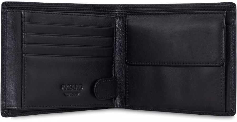 Шкіряне портмоне Picard BROOKLYN Pi2809-043-001. Горизонтальне чоловіче портмоне чорного кольору для щоденного використання. Зручна модель стане справжнім подарунком для шанувальників ергономічних та компактних аксесуарів. У портмоне два відділення для банкнот, дев'ять відділень для пластикових карток, кишеня для дрібниць, відділення для документів. Портмоне поєднує у собі чудові функціональні можливості та елегантний дизайн. Підійде чоловікам, які цінують практичні та якісні речі. Високоякісна шкіра. Колір чорний. Розміри: 12x10x3см. Вага: 0,1 кг Виробник: Німеччина Гарантія: 2 роки