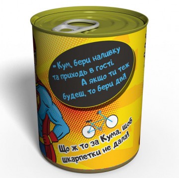 Хочете зробити Куму приємно, тільки щоб чоловік НЕ робив нерви? Подаруйте йому оригінальний подарунок - Консервовані Шкарпетки Супер Кума. Запевняю Вас, ось такого подарунка кум буде на сьомому небі від щастя!