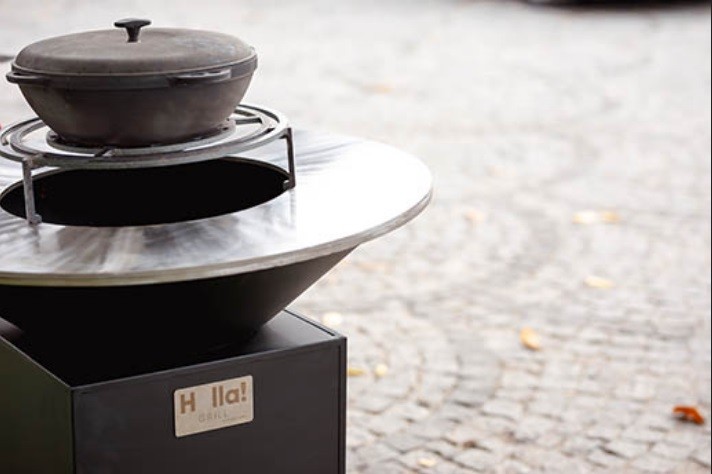 Стильний та елегантний HOLLA GRILL із термостійких матеріалів, які придатні для харчової промисловості, безпечні для здоров'я та не виділяють при нагріванні шкідливих речовин. Конструкція HOLLA GRILL - це відкрита тумба з чашею у формі конуса з поверхнею смаження з високовуглецевого металу. Тумба відкритого типу дозволяє зручно розміщувати дрова та інші паливні матеріали в ніші, завдяки чому вони залишаються сухими і захищеними від опадів. Вкрита тумба термостійкою емаллю, яка легко переносить температуру до 600 °С. Конусоподібна чаша HOLLA GRILL розігрівається протягом 20-25 хвилин, після чого можна розміщувати та готувати на її смаженій поверхні різні продукти: птицю, м'ясо, ковбаски, рибу, овочі та інше. Гриль оснащений ніжками для стійкішого становища, і коліщатками, щоб переміщати чашу з тумбою по ділянці, зручно транспортувати.