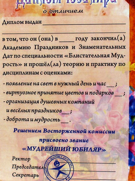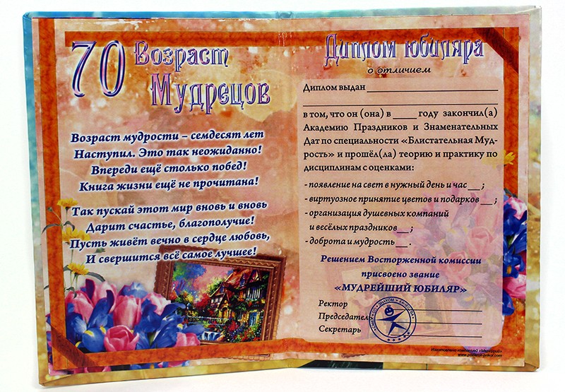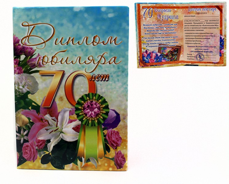 Диплом послужить чудовим доповненням до основного подарунка, який зробить привітання незвичайним та оригінальним. Усередині диплома - форма для заповнення, куди можна вписати ПІБ винуватця урочистості, а також Ваші вітання. Все це зробить диплом виключно персональним подарунком.