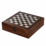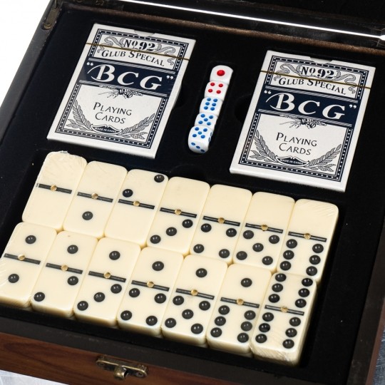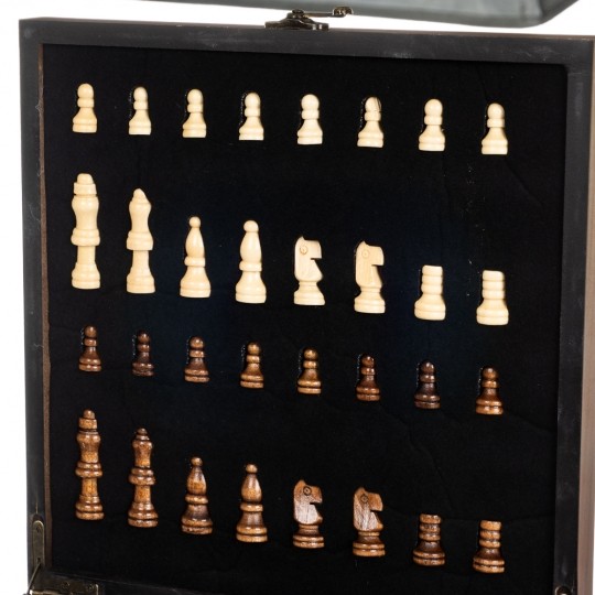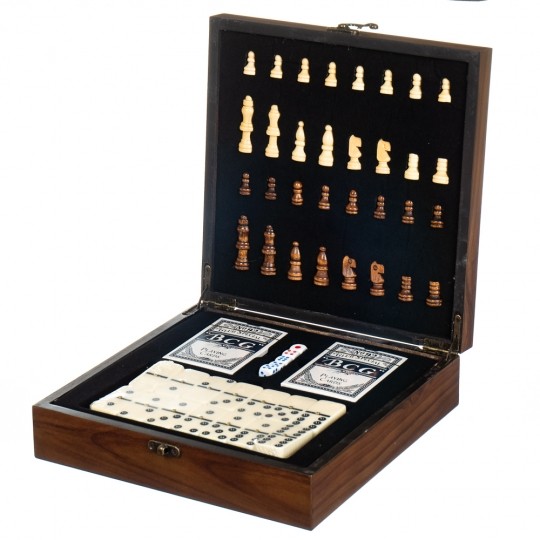 Оригінальний подарунковий набір для любителів шахів. Комплект виготовлений із високоякісних матеріалів, які дуже приємні тактильно та не мають сторонніх запахів. Усередині також набір доміно, кубиків та карт.