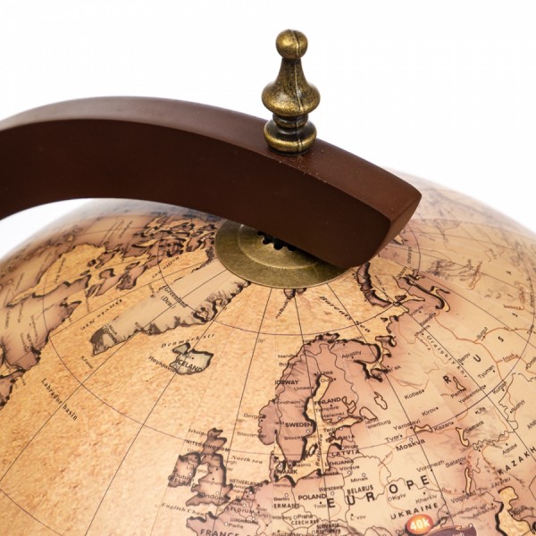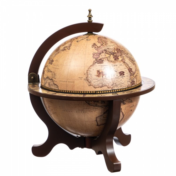 До вашої уваги пропонується стильний та функціональний міні-бар у вигляді глобуса. У процесі створення виробу були використані виключно високоякісні матеріали, серед яких дерево та пап'є-маше. На столику реалізовані платформи для зберігання алкогольних напоїв та супутнього приладдя. Комфортне переміщення виробу забезпечує компактний розмір. Представлений міні-бар – це не тільки вкрай зручний у безпосередньому використанні виріб, але і яскравий декоративний елемент, який стане оригінальним доповненням розкішного інтер'єру.