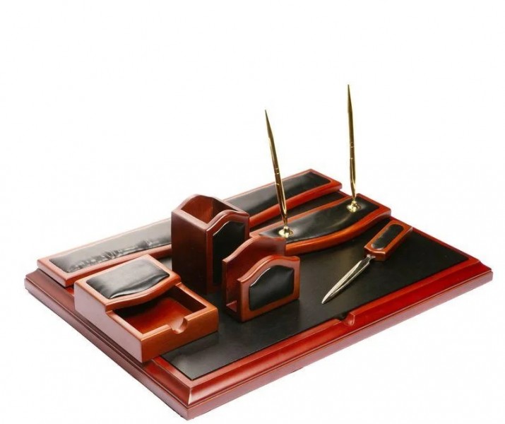 Функціональний та елегантний подарунок, який чудово підійде для ділової людини. Виготовлений із натуральних матеріалів, також використовуються вставки із прес шкіри. Набір продається в подарунковій упаковці. Ніж для листів спростить роботу з кореспонденцією.