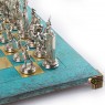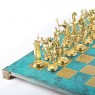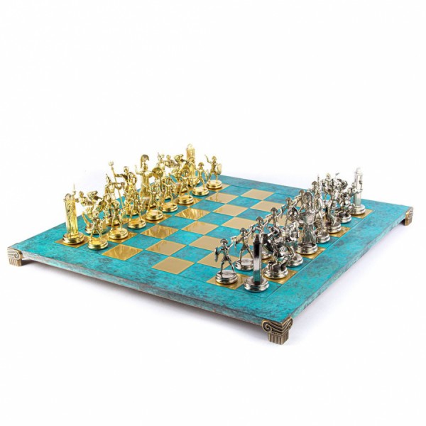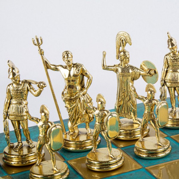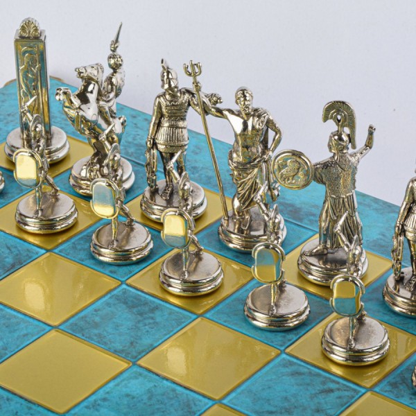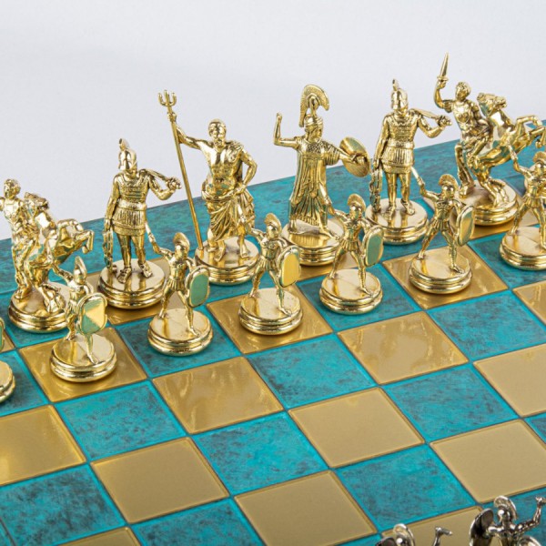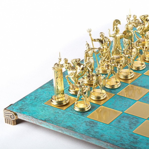Подарункові шахи ручної роботи ""Грецька Міфологія"" – з розкішними deluxe фігурами екстра великого розміру від грецької фірми з виробництва шахів Manopoulos, пофарбовані під золото і срібло на величезній платиновій дошці бірюзового кольору розміром 54x54 см. Легенда могутніми богами. Бог моря Посейдон і богиня мудрості Афіна, кожен хотів, щоб місто було названо на честь себе. Божественний конфлікт був жорстоким, тому Зевс оголосив, що кожен бог має зробити найкращу пропозицію громадянам. Посейдон підняв свій тризуб і вдарив скелю Акрополя, де спалахнула морська вода. «Він попередить вас про майбутні шторми. Ваше місто підкорить моря», – сказав він. Афіна опустилася навколішки і торкнулася землі, де почало рости оливкове дерево. «Для їжі, олії, дерева та світла. Ваше місто стане символом цивілізації». Незважаючи на лють Посейдона, подарунок Афіни був кращим, і з того часу місто називають Афінами.