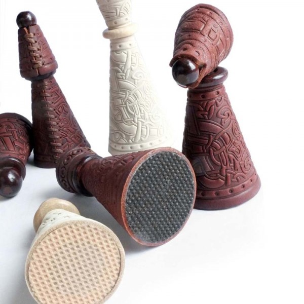 Ручна робота. Натуральне дерево обтягнуте натуральною тисненою шкірою. Виріб якісний. Не легкі, зі спеціальним обтяжувачем, щільні, міцні, не мнуться при стисканні, надійні. На дошці виглядають дуже стильно. У руках тримати приємно. Висота "Пішак" - 60 мм, "Король" - 105 мм, діаметр 33 - 40 мм.