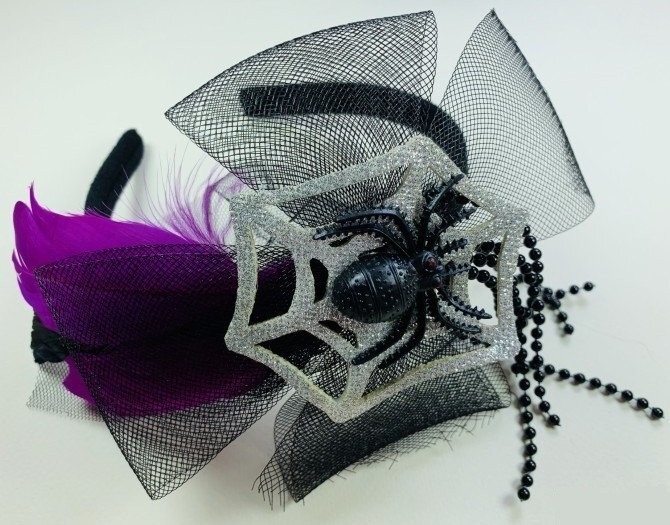 Обруч прикрашений атрибутами до свята: павутинням з павуком, а також, фатин, намистинками та фіолетовим пір'їнком