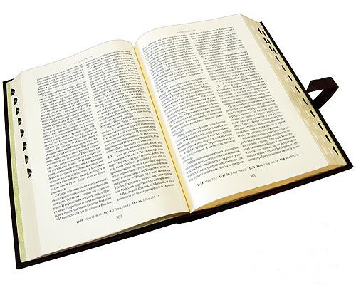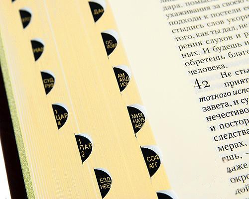 При виготовленні цієї біблії була використана шкіра спеціальної вичинки. На протязі всього процесу виробництва: (золоте тиснення корінця, шліфування палітурного картону, золочення обріза) використовується тільки ручна робота. Біблія містить індекси для пошуку біблійних книг.