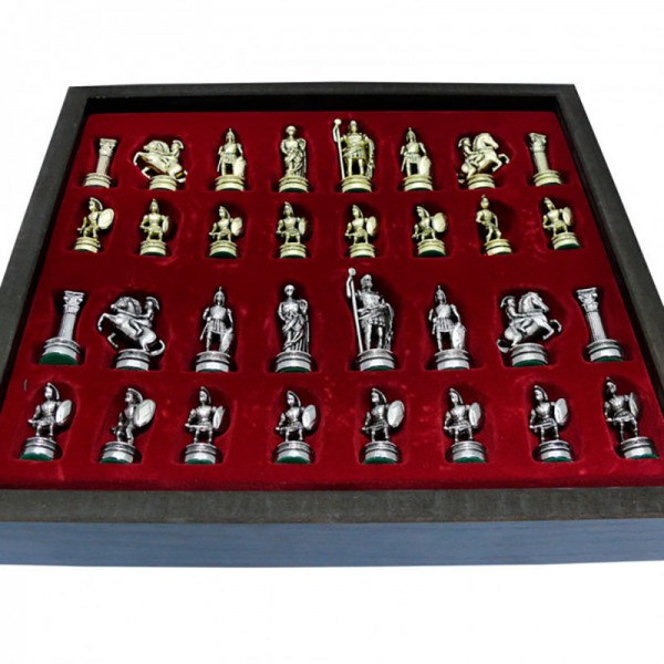 Шахи Римляни від компанії Manopoulos поставляються у дерев'яній коробці. Фігурки акуратно влаштовуються у спеціальне відділення (пластикова форма покрита, проклеєна червоним оксамитом).