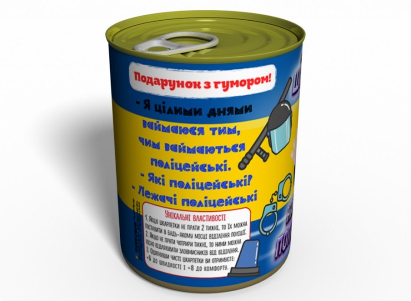 Чи плануєте зробити подарунок поліцейському? Пропонуємо зробити це оригінально, подаруйте Консервовані шкарпетки кращого поліцейського. Такий подарунок напевно сподобається вашому поліцейському. День поліції в Україні відзначається 4 липня.