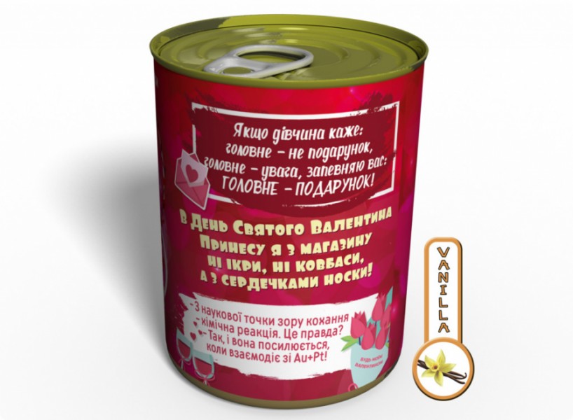 14 лютого у багатьох країнах світу святкується День Святого Валентина, так само ще називається День Всіх Закоханих. Це свято не обійшло Україну стороною і святкується досить в багатьох сім'ях, хоч це і католицьке народне свято. У цей день прийнято дарувати подарунки своїм коханим, а так само і друзям. Зазвичай це: різноманітні валентинки у формі сердець, квіти, м'які іграшки та прикраси. Ми ж пропонуємо зробити подарунок більш незвичайний і подарувати консервовані Жіночі Шкарпетки На День Святого Валентина. Такий подарунок напевно сподобається вашій половині і викличе яскраві емоції.