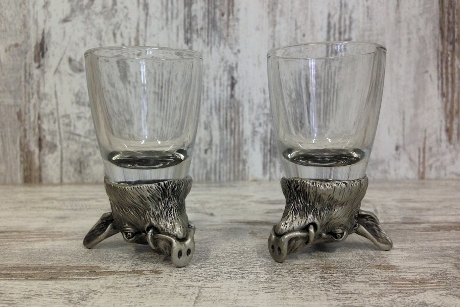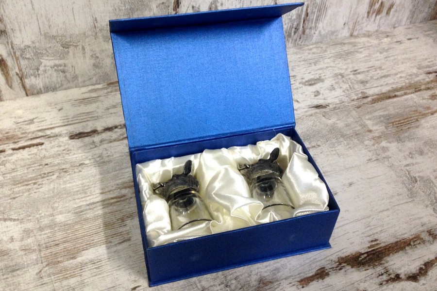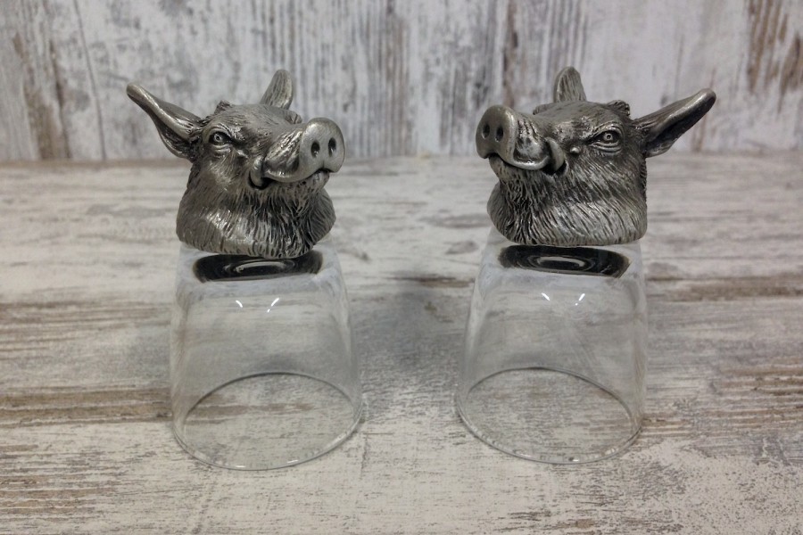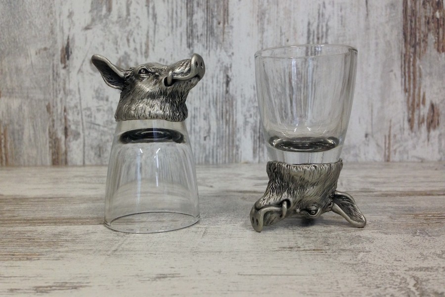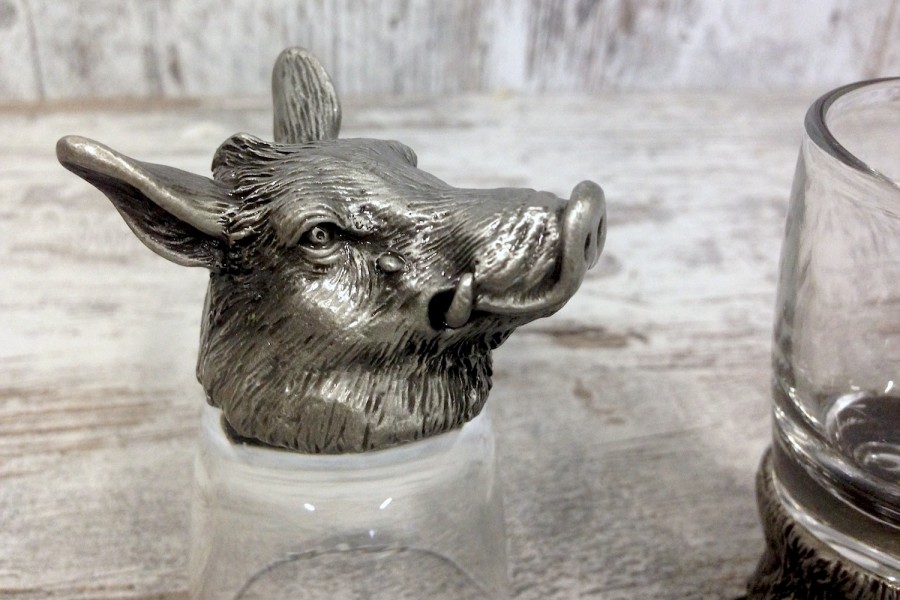 Оригінальний набір з двох чарок перевертнів у вигляді голови кабана стане чудовим подарунком. Голова кабана виготовлена зі сплаву міді та олова. Сама чарка з високоякісного скла. Чарки упаковуються в подарункову коробку та фірмовий пакет.