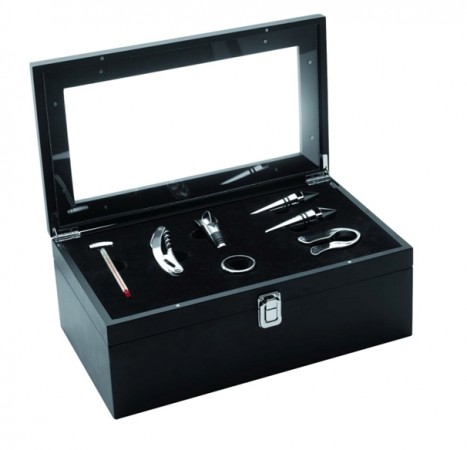 Винний набір що складається з 7 предметів з відполірованої сталі та футляра для 2 пляшок - гідний подарунок для майбутніх сомельє або для любителів і цінителів вина. Винний набір стане чудовим доповненням Вашого бару.